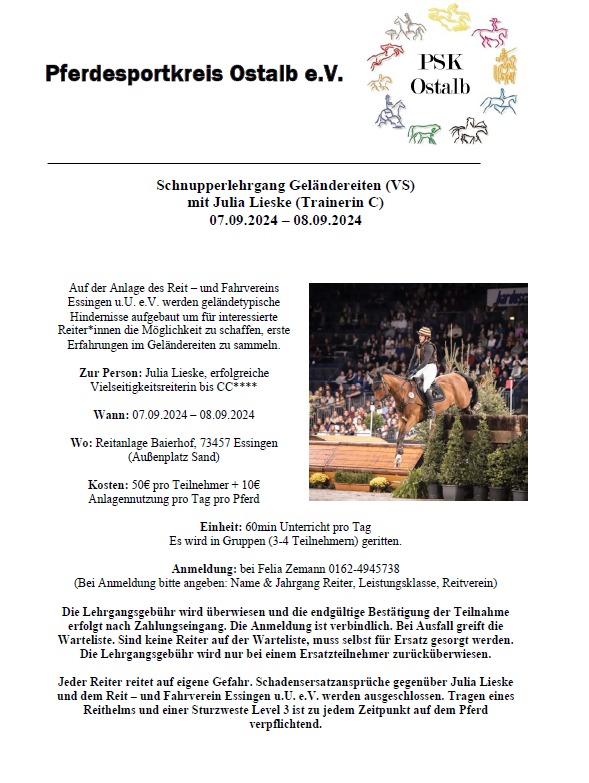 Lehrgang: 07.09.2024 – 08.09.2024 Schnupperlehrgang Geländereiten (VS) mit Julia Lieske (Trainer C)