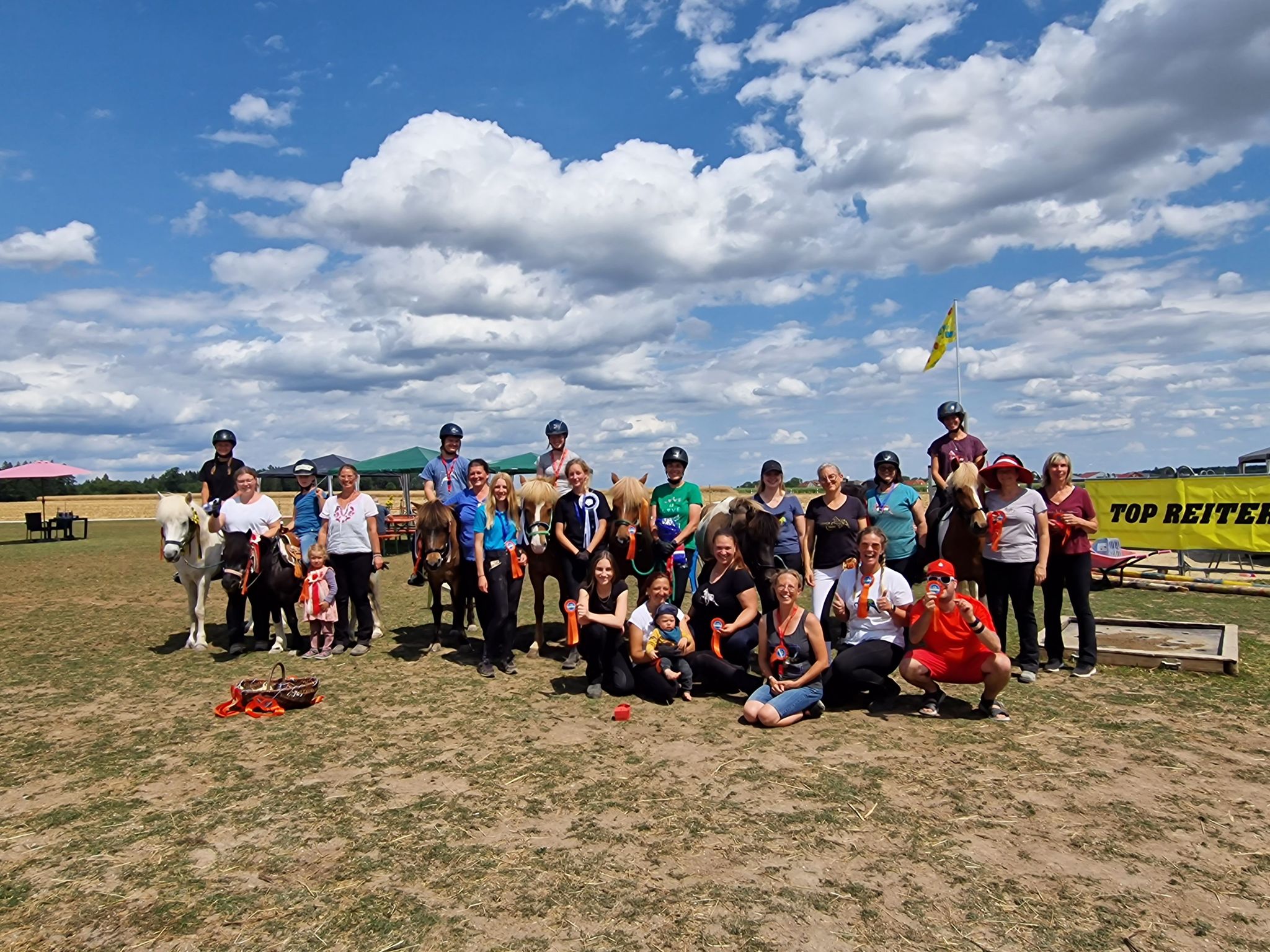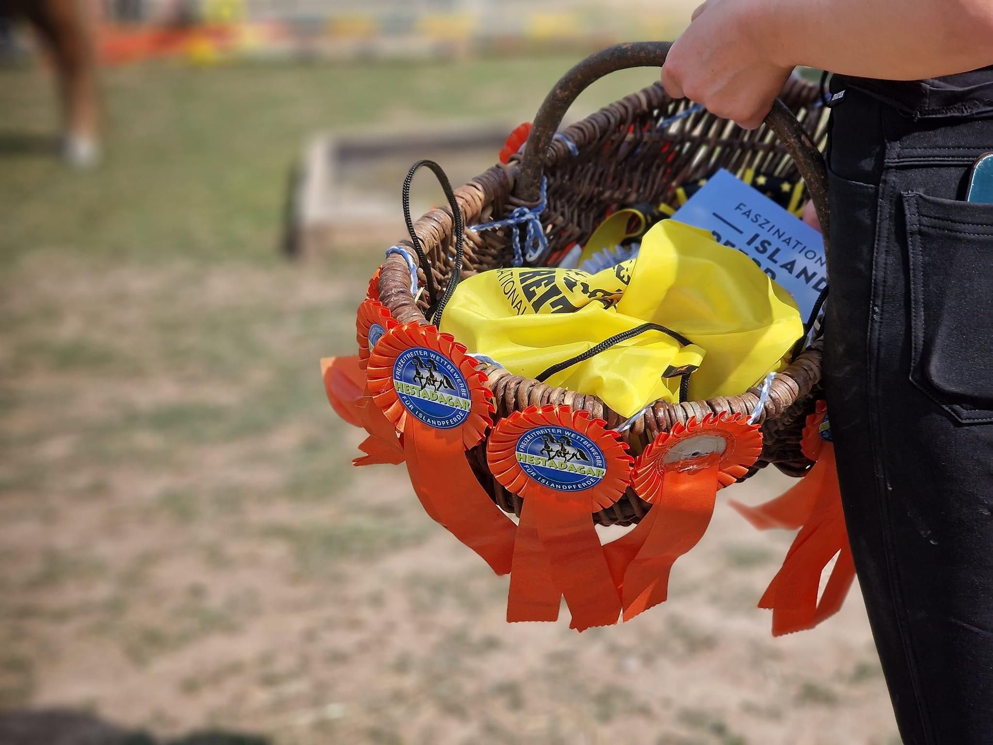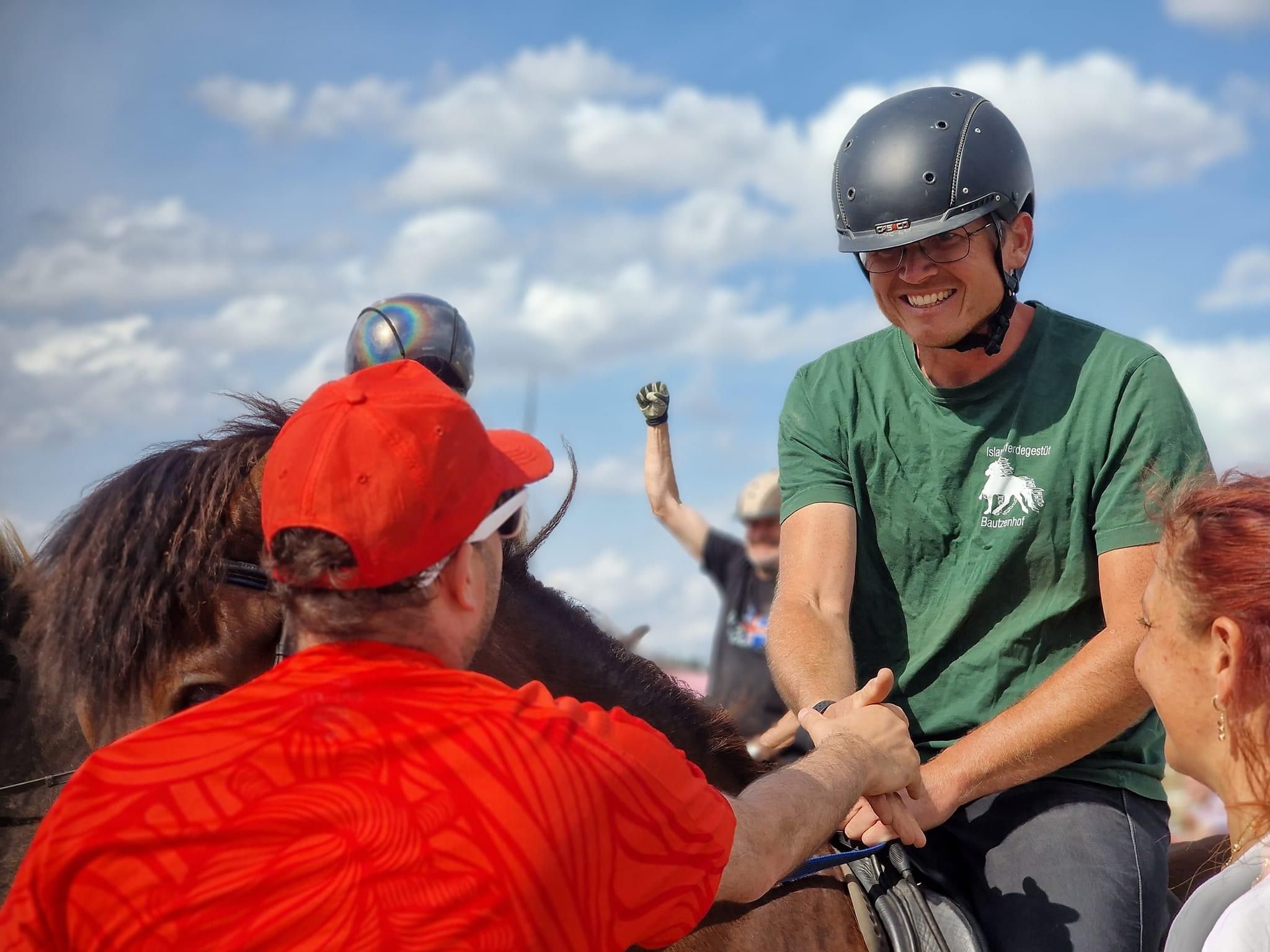 Alle paar Jahre wieder wollen wir das Islandpferd, unseren Verein samt Mitgliedern und unsere Hofgemeinschaft feiern. Dann ist es mal wieder Zeit für ein Hoffest. Die Planungen für das diesjährige Sommerevent begannen bereits vor über einem Jahr. In zahlreichen Online- und Vor-Ort-Besprechungen im kleinen Kreis sowie mit den hilfsbereiten Vereinsmitgliedern diskutierten wir über das Programm zur Kinderbetreuung, die gewünschten Hestadagar-Wettbewerbe, welche Sponsoren man ansprechen könnte, wie das kulinarische Angebot aussehen soll, und vieles mehr. Ein heikler, aber besonders wichtiger Punkt ist stets die Terminfindung. Wann sind Turniere im Umkreis, wann haben wir selbst ein freies Wochenende im Kalender, wann sind Sommerferien, wann wird das Wetter voraussichtlich am besten passen…Wir entschieden uns für den 22. Juli. Zutatenmengen kalkulierten wir gemeinsam, bestellten Getränke, eine mobile Toilette, entwarfen außergewöhnliche Schleifen, sammelten Sachpreise für die Wettbewerbsteilnehmer und die Tombola, planten das Kinderprogramm und machten Probeläufe unserer Verpflegungsideen. In der Woche des Festes war dann der große Hofputz angesagt. Aufräumen, aussortieren, ordnen, umstellen, putzen, aufbauen… Auch hier fanden sich immer wieder engagierte Vereinsmitglieder ein, die bereits im Vorfeld mit anpackten. Am Samstag war dann alles bereit: Pavillons waren aufgebaut, Gemüse für die Flammkuchen und Baguettes geschnitten, Kaffee und Kakao für Eisgetränke kaltgestellt, die Tombolapreise mit Nummern versehen, der Roundpen war zum Kinderparadies geworden, mit Blumen dekorierte Sitzgelegenheiten luden im Inneren der Ovalbahn zum Zuschauen und Verweilen ein. Morgens trudelten zahlreiche Helfer sowie Teilnehmer von auswärts ein. Jeder Helfer hatte seine Aufgabe zugeteilt bekommen und die Kuchentheke füllte sich zusehends mit selbstgebackenen Leckereien. Bei blauem Himmel und einer angenehmen Brise ging es am Vormittag mit den ersten Wettbewerben los. Über den gesamten Tag hinweg liefen Tölt- und Gangwettbewerbe, die den Zuschauern demonstrierten, was die Islandpferde ausmacht. Gespickt hatten wir das Programm mit einigen Geschicklichkeits- und Geschwindigkeitswettbewerben, die leicht verständlich sind und Teilnehmer sowie Zuschauer unterhalten und für den ein oder anderen gemeinsamen Lacher sorgten. Beim Fahnenrennen ging es heiß her, auch Shetty Max war mit von der Partie und musste sich mit seinen deutlich kürzeren Beinen gleich doppelt anstrengen. Der Wettbewerb Blinder Führer sorgte für viele amüsante Momente, wenn die Pferdeführer mit verbundenen Augen vom Reiter angewiesen wurden, das Pferd um eine Tonne, durch ein Stangenlabyrinth und über eine Plane zu führen. Das eine Team marschierte quer durch das Labyrinth, beim anderen verfehlte das Pferd komplett die Plane, wieder andere verirrten sich in die komplett andere Richtung des Parcours… Ein herrlicher Wettbewerb für alle Teilnehmer mit hohem Unterhaltungswert für die Zuschauenden. Das Double Race verlangte den Reitern Taktik und Einfühlungsvermögen ab, wenn sie versuchten, eine vorgegebene Strecke mit Wendung zweimal in möglichst identischer Zeit abzureiten. Beim Aufmarsch aller Teilnehmer durfte sich jeder über eine Teilnehmerschleife freuen. Hohen Besuch bekamen wir von Hans-Peter Ruberg vom PSK Ostalb und Christian Ziegler vom Sportkreis Ostalb, die extra gekommen waren, um Lena und Ari für ihr langjähriges Engagement im Ehrenamt unseres Vereins mit je einer Urkunde und einer Ehrennadel zu würdigen. Ein besonderer Moment in der Ovalbahn!